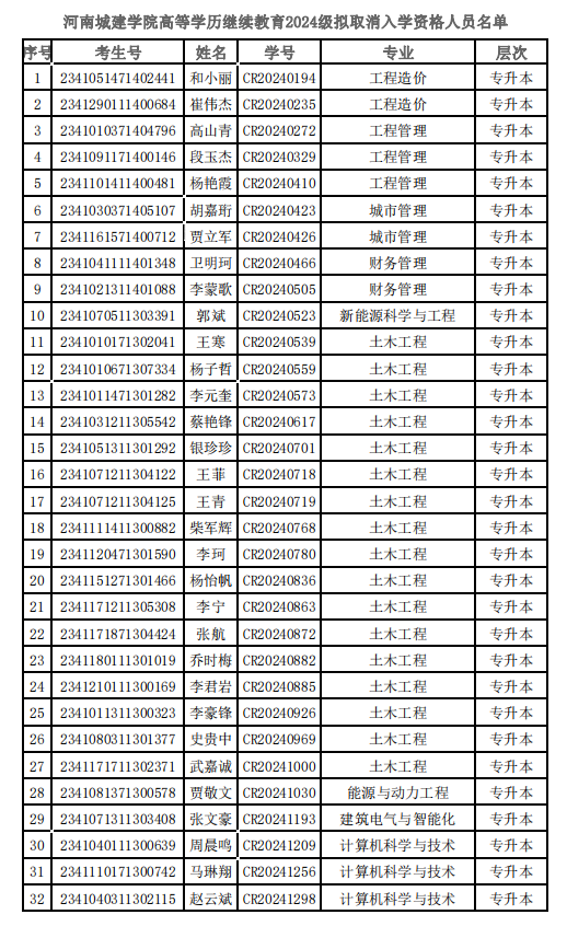 附:EMC易倍官方网站高等学历继续教育2024级拟取消入学资格名单