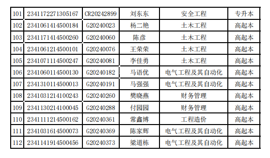 根据国家教育部《高等公司员工学籍学历电子注册办法》、《河南省教育厅关于做好普通高等公司录取新生入学资格复查和学籍电子注册工作的通知》和《EMC易倍官方网站成人高等教育员工学籍管理规定》等文件精神,经EMC易倍研究决定,拟取消高等学历继续教育2024级和小丽等112人的入学资格。