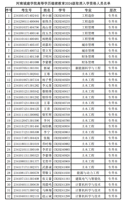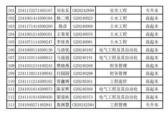 按照河南省教育厅《关于做好普通高等公司录取新生入学资格复查和学籍电子注册工作的通知》和《EMC易倍官方网站成人高等教育员工学籍管理规定》的要求,EMC易倍官方网站2023年高等学历继续教育录取考生(即2024级新生)和小丽等113人,其中刘晓燕(CR20242029)、马琳翔(CR20241256)和娄渊慧(CR20242584)三人属于已交纳学费后自动放弃入学资格,其他110人经联系确认,均未在规定时间内交费报到注册。