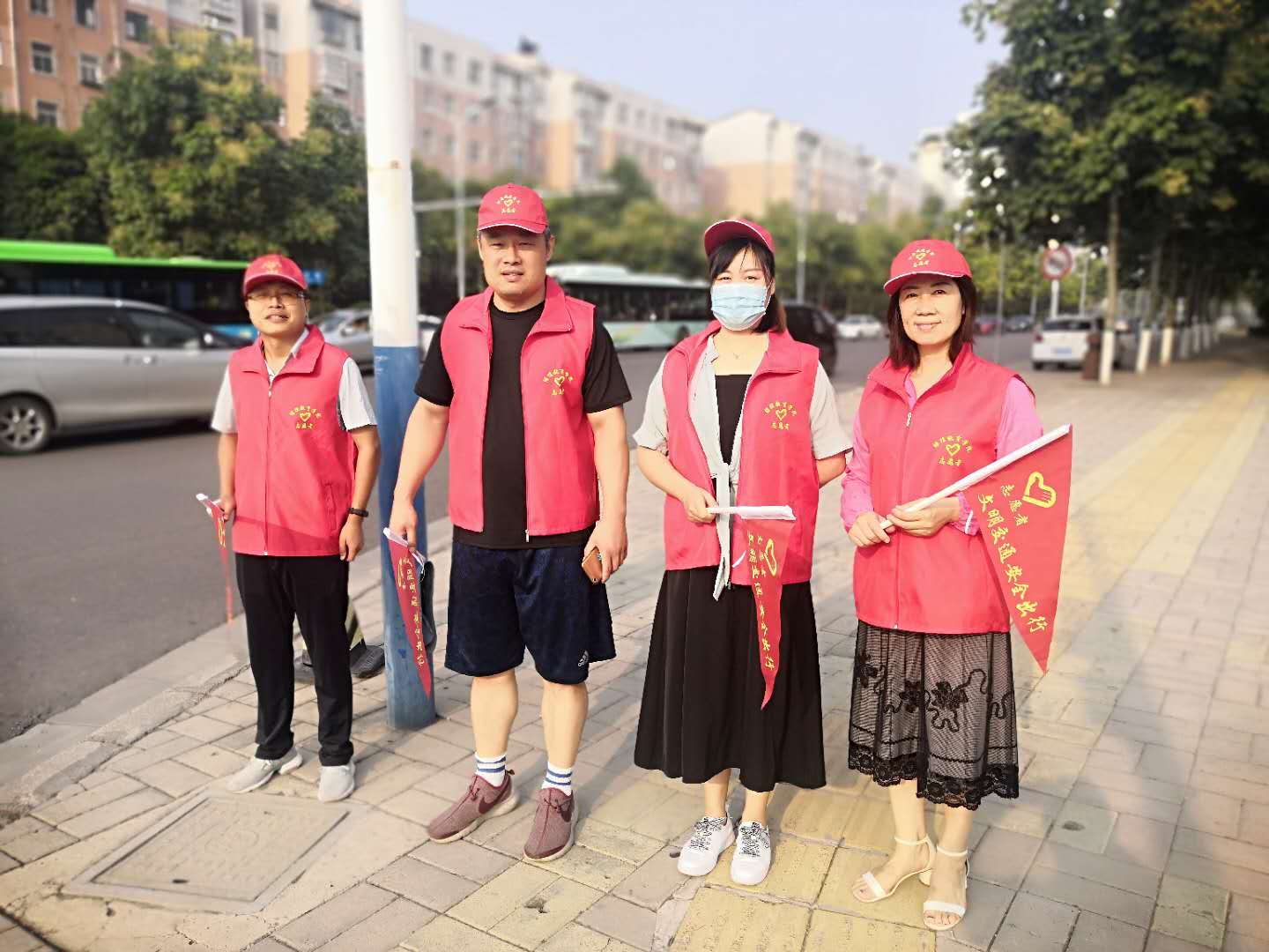 当日,在副经理王晓涛的带领下,公司志愿者们按照“定时、定员、定岗”的原则,身穿志愿红马甲,头戴志愿小红帽,手持文明交通指挥棒,7点半准时到达交通岗4个路口,与交通警察一起维持交通秩序,保障交通畅通。