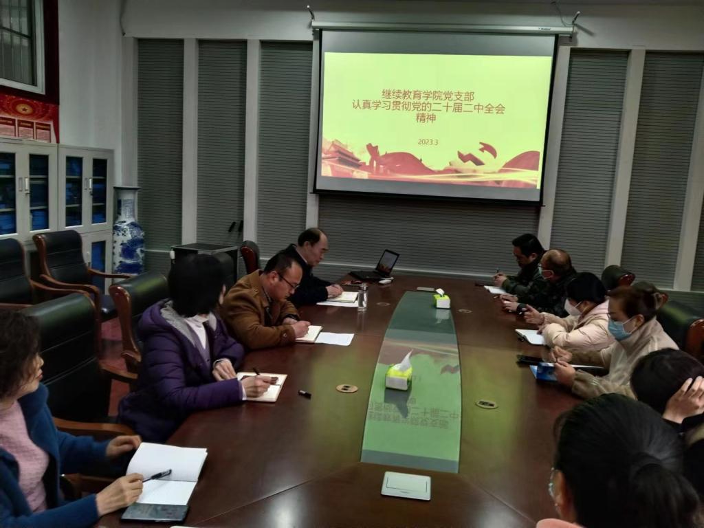 继续教育公司党支部于3月21日下午召开专题会议,认真学习贯彻党的二十届二中全会精神,全体教工党员参会,会议由支部书记殷战稳主持。
